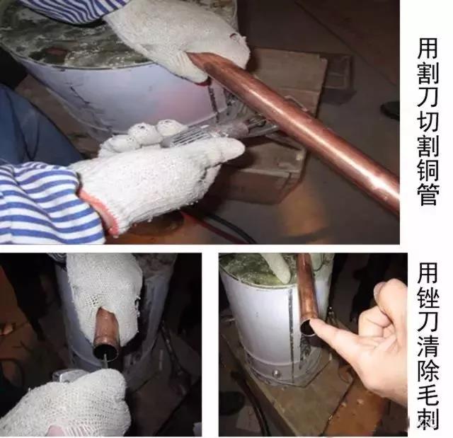 用割刀在銅管前端將襯塑部分隔開并與銅管隔離,然后用手和鉗子將襯塑部分將銅管前端10cm剝離,杜絕用小刀剝離,造成銅管劃痕。